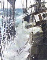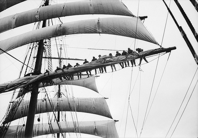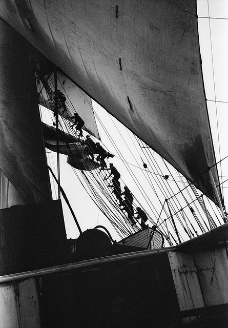 Villiers also took many remarkable photographs. Thanks to Captain Richard Bailey for pointing out this Collection of Photographs by Alan Villiers, which features hand-colored photographs from ships Villiers sailed, as a well as a succinct biography of Villers’ remarkable career. Britain’s National Maritime Museum has posted additional photos: The Last of the Tall Ships: Photographs by Alan Villiers.