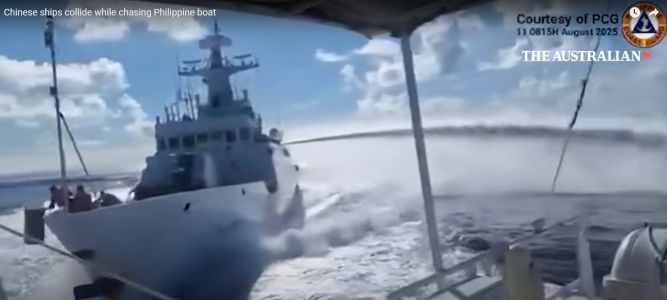 Videos published by the Philippine Coast Guard show the two Chinese vessels on either side of the Filipino ship, boxing it in. A short while later, the Chinese Coast Guard vessel CCG-3104 was chasing the BRP Suluan at high speed and trying to spray it with a water cannon. As it was about to overtake the Philippine cutter, CCG-3104 made a sharp turn to the starboard side. That’s when the Chinese Navy destroyer Guilin comes back into view, making a high-speed, perpendicular cross past the Suluan’s stern, slicing into the Chinese Coast Guard vessel CCG 3104’s bow as the Philippine crew cheers. Videos then show extensive damage to the Chinese Coast Guard vessel’s bow, while the Chinese destroyer had scraping on its port bow and along the port side.
